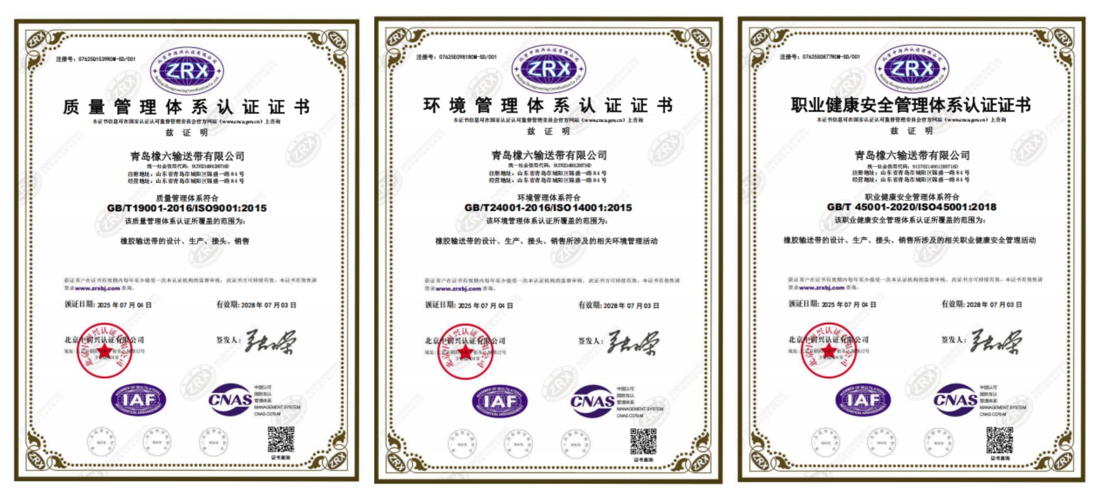 審核組通過對公司最高管理層及各部門的現場審核認為:公司是專業生產橡膠輸送帶產品的企業,技術領先,領導重視,注重產品質量及現場管理。公司按管理標準建立的管理體系與審核準則是符合的,在確保管理體系持續的適宜性、充分性、有效性和改進方面管理評審過程是具備能力的。特別提出了公司新領導班子團結務實,有良好的社會責任感和以人為本的理念,目標明確,措施可行,充分發揮技術優勢,使企業得到可持續發展。審核組一致同意推薦公司的質量、環境和職業健康安全管理體系的認證注冊。